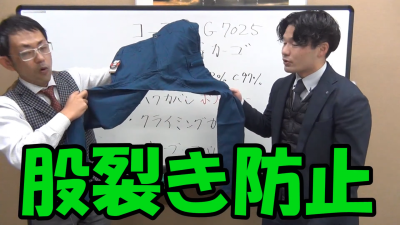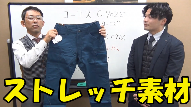 動画内でスタッフが実際に着用して検証している通り、見た目のタフさからは想像できないほどの「心地よいマスターストレッチ」を発揮します。ポリウレタンを3%配合することで、適度なハリ感を保ちつつ、屈む、しゃがむといった現場特有の激しい動きにも窮屈さを感じさせません