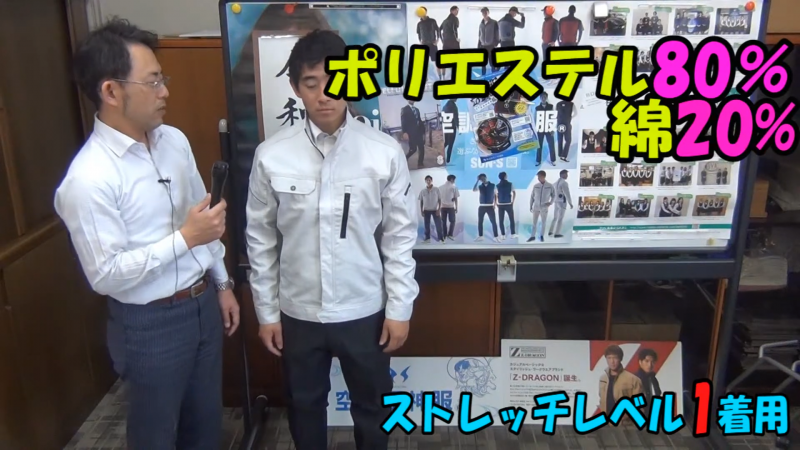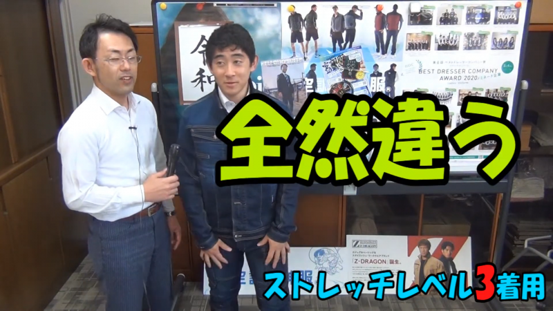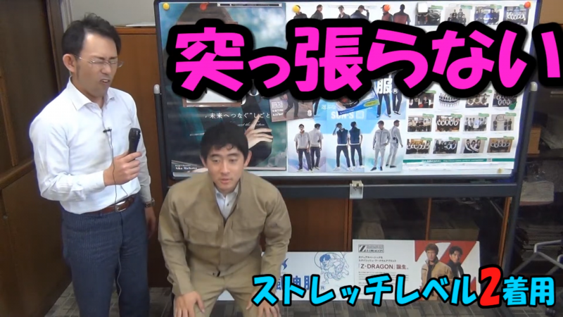 動画内でも「全然違う!ビヨンビヨンに伸びる!」と驚きの声が上がった通り、あらゆる動きに生地が追従します。深い屈伸も、腕を大きく回す動作も、ストレスはゼロ。高所作業や狭い場所での作業など、体の柔軟性を極限まで使う現場において、この「レベル3」はもはや必須の装備と言えるでしょう。一度この解放感を味わうと、他の服には戻れません。