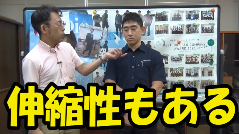 サイズ展開も幅広く、動画では身長163cm・体重70kgのスタッフがLサイズを着用して程よいゆとりを見せています。タイトすぎず、かつスマートに見えるシルエットは、老若男女問わず着用できるユニバーサルデザインと言えるでしょう。チーム全員で揃えることで、組織の連帯感とブランドイメージの向上に寄与します。