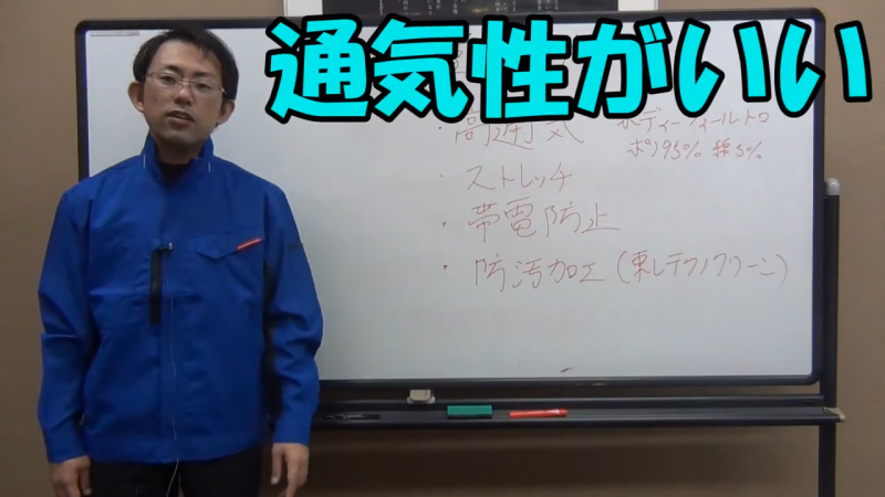 動画内でも紹介されている通り、光にかざすと反対側が少し透けて見えるほどの薄さと通気性を持っています。しかし、着用時には決して不自然な透け感はなく、空気が服の中を通り抜けるような爽快感を実感いただけます。帯電防止JIS規格にも適合しているため、静電気を嫌う精密機器の現場などでも安心してご使用いただけます。