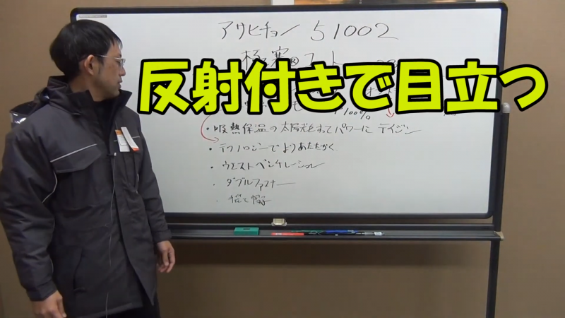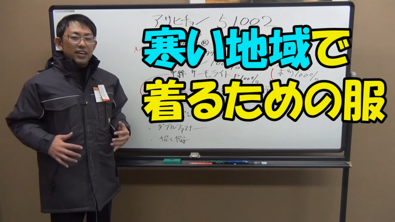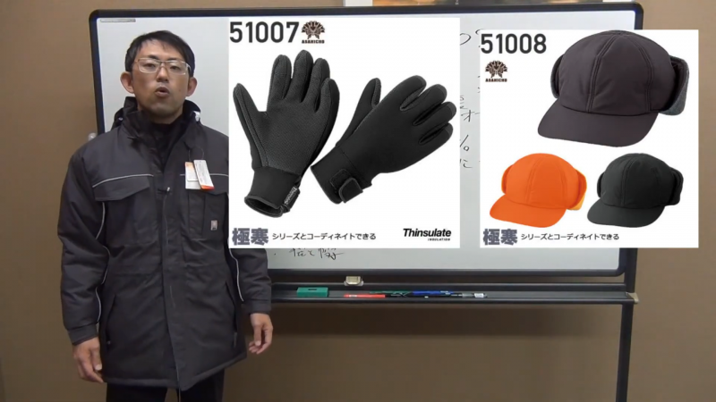 旭蝶繊維 51002シリーズは、コート単体での性能もさることながら、防寒パンツ、手袋、帽子といったアクセサリーも展開されています。動画内でも、「フルセットで買っていただく」ことで、全身を極寒仕様で保護できる点が強く推奨されています。